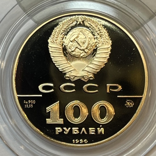 Аверс: сверху герб СССР с 15 витками ленты, под ним буквы «СССР», ниже слева и справа черта, под чертой слева химическое обозначение «Au» и проба «900» металла из которого сделана монета, под ними чистый вес драгоценного металла «15,55», под чертой справа монограмма монетного двора «ММД», ниже обозначение достоинства монеты цифра «100» и ниже слово «РУБЛЕЙ», внизу у канта год выпуска монеты «1990».